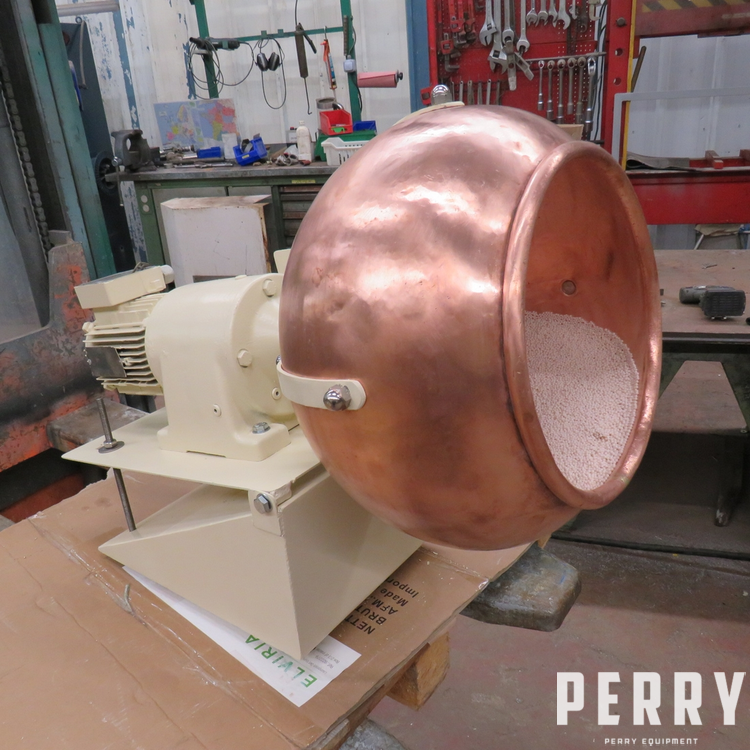 Used Copper coating pan. Coating drum measures approximately 400mm diameter, 270mm depth. Opening 270mm. Driven by a 0.37kW 220/380 Volt 26 rpm geared motor.