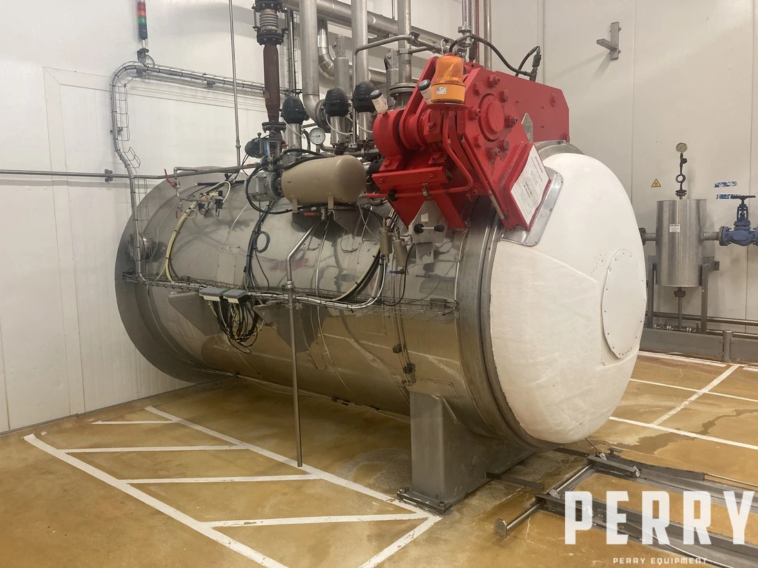 This industrial autoclave is designed for thermal processing under pressure, particularly in the food and pharmaceutical industries.