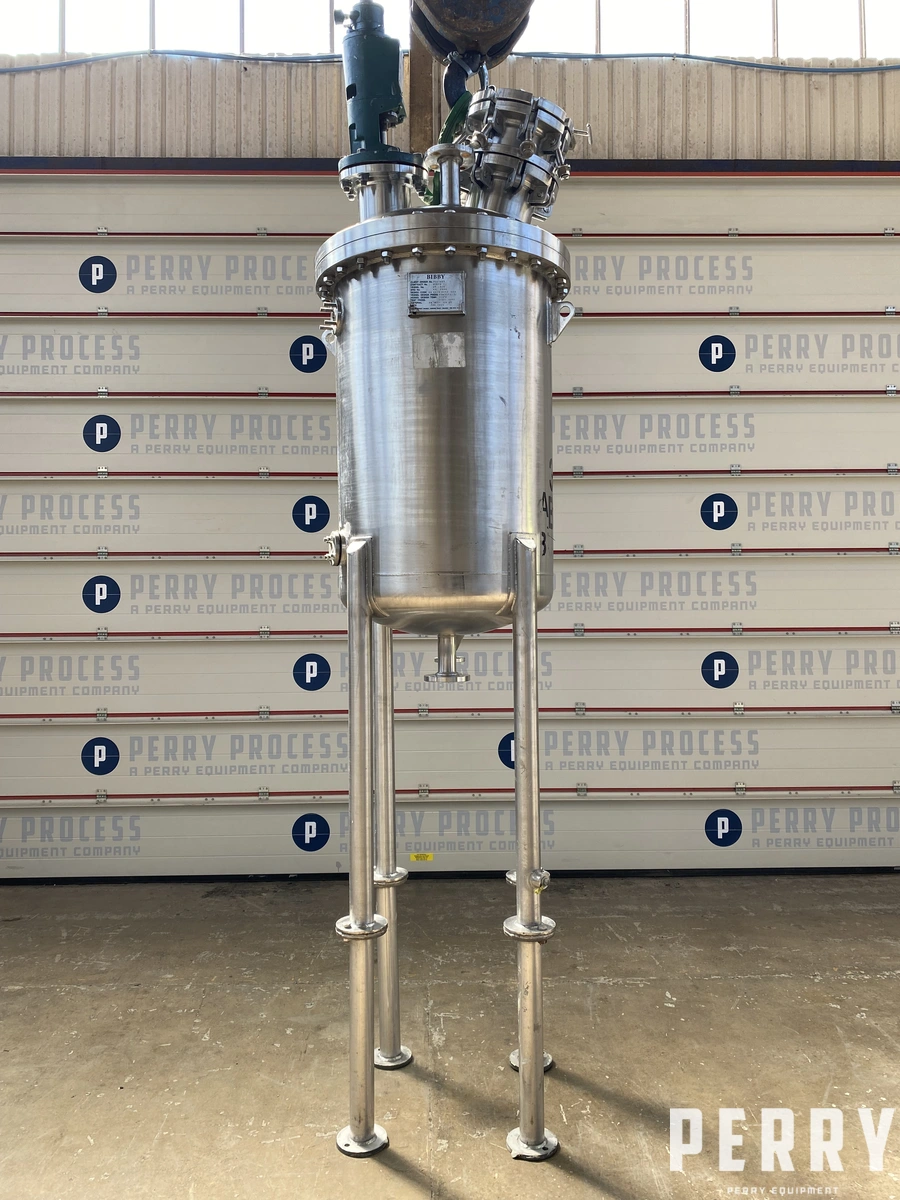 Used Bibby approximately 300 litre capacity 316 stainless steel vertical mixing vessel. Unit has welded dished top and bottom heads. Internal rated 3.48 bar/full vacuum design pressure at 100 deg.c. Unit has top entry off-site stainless steel agitator driven by Lightnin model LS25A air operated drive. Unit is mounted on (4) stainless steel legs.