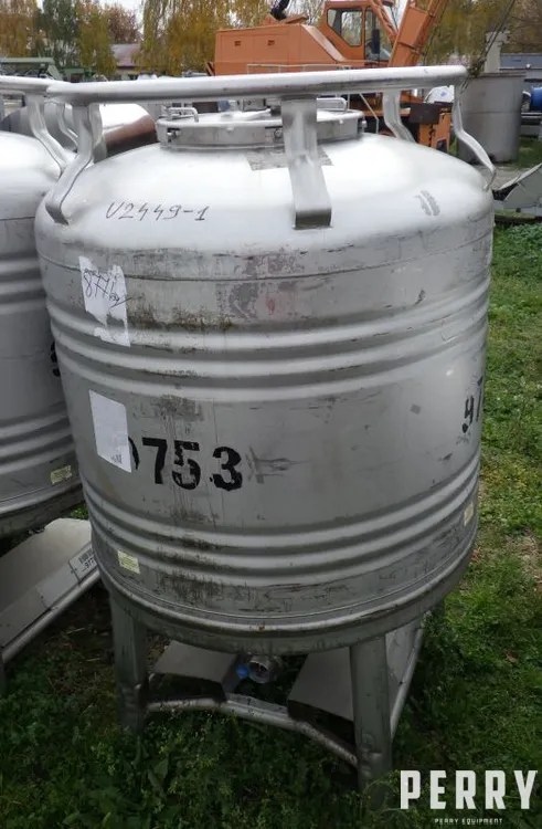 Used vertical stainless steel storage tank. Total volume 800 l. Tank has internal diameter 1000 mm x length of straight side of wall 890 mm. Top welded with central manway, with diameter 400 mm and lid. Bottom conical, with central discharge outlet, with manually operated valve. Tank is mounted on 4 stainless steel legs and has two skids for work on forklift. Last time used in food industry.