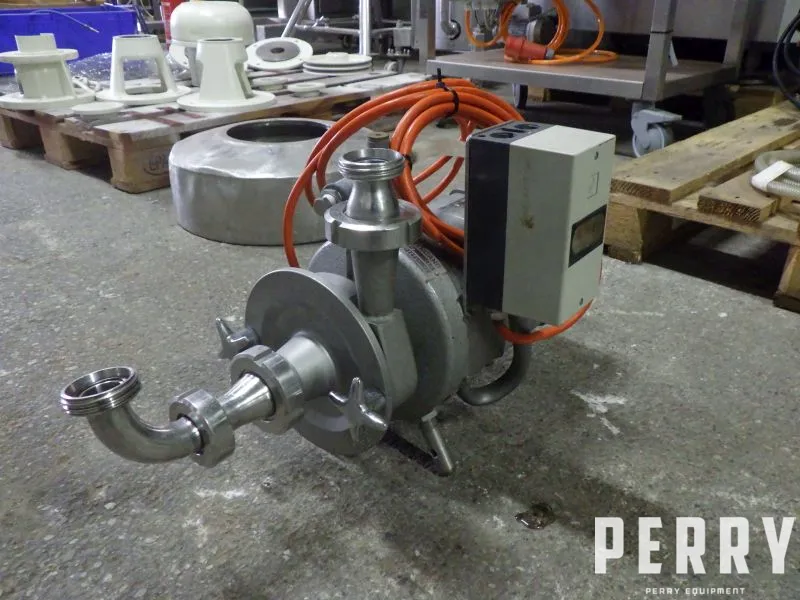 Used centrifugal pump by Fristam (DE). Contact parts designed in stainless steel. Inlet and outlet have connection diatemer 1". Pump is directly driven by el. motor 1.1 kW, 2830 rpm, 220/380 V, 50 Hz. Shaft has mechanical seal. Mounted on 3 stainless steel supports.