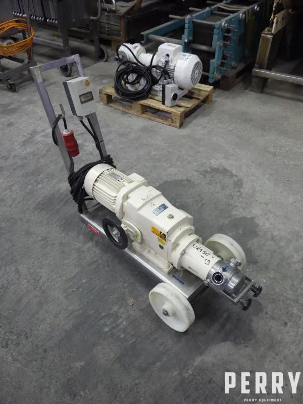 Used stainless steel contact parts sinusoidal MasoSine Pumps model SPS 1. Pump has inlet and outlet connections with diameter 1". Sinusoidal screw is designed in black plastic, housing designed in stainless steel. Pump is driven via varispeed gearbox by el motor 2.2 kW, 2885 rpm, 360-440 V, 50 Hz. Working rotation of pump adjustable in range from 72 - 360 rpm. Pump is mounted on stainless steel mobile cart with local start/stop box.