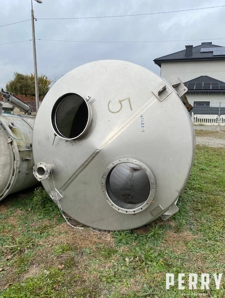 Used stainless steel bin for powders by MOSCHLE (Germany) with working volume 5200 l. Tank dimensions: diameter 2040 mm, length of straigth side of wall 940 mm. Conical bottom slanted to one side is 1700 mm high. Silos has top mounted inlet with diameter 500 mm and manway with diameter 500 mm, missing lid. Bottom discharge outlet has diameter 800 mm. Silos is mounted on four carbon steel legs.