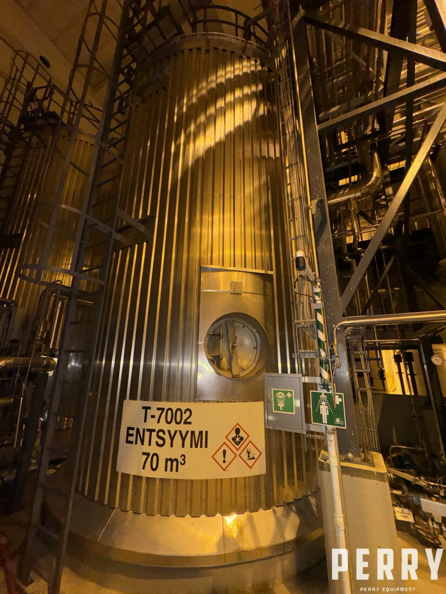 Used Nakkila approximately 70,000 litre 304L stainless steel vertical storage tank. Unit measures approximately 3,700mm diameter x 6,600mm straight side.