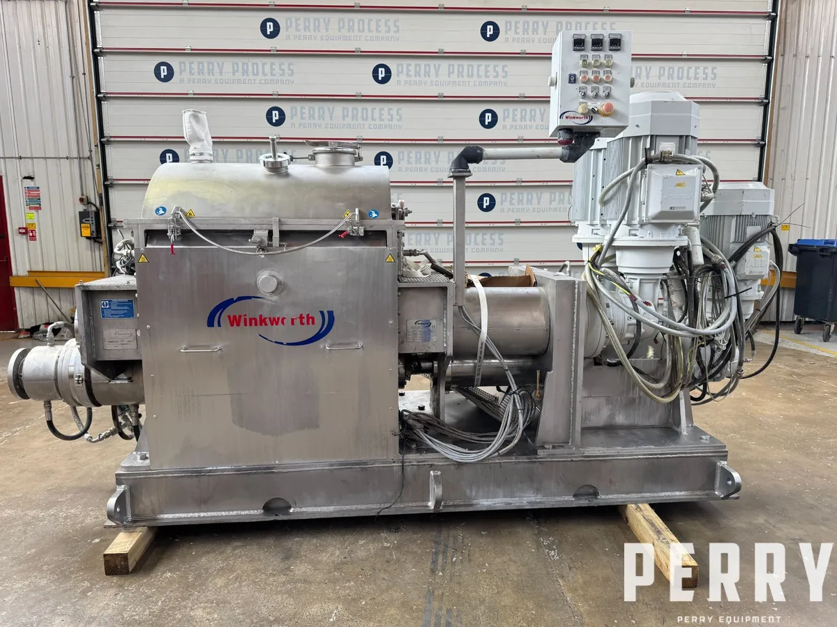 Used Winkworth model ZX500-6 stainless steel jacketed z-blade mixer / extruder. Approximate working capacity 500 litre with total capacity 778 litre (product dependent). 304 stainless steel chamber measures approximately 1,090mm long x 956mm wide x 735mm deep. Unit has domed hood/lid with clamps. 304 stainless steel external jacket. Each Z-blade driven by 30kw motor/gearbox. Stainless steel screw discharge driven by 22kw motor/gearbox. Unit includes control panel. Includes (1) used Tool Temp model TT-14500 H and (1) Used Tool Temp model TT-508 X heater/cooling units. Also includes (3) Hydac oil coolers mounted on common frame. Unit has main control unit and local operator controls.