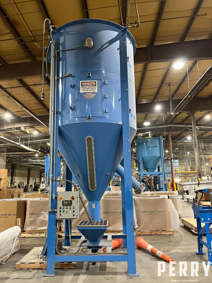Used Eagle Group steel vertical screw blender with maximum capacity of 350 cubic foot. Driven by 15 hp 480 volt motor. Will accommodate a maximum of 12,000 lbs. of product based on 34 lbs. per cubic foot material. New in 2016.