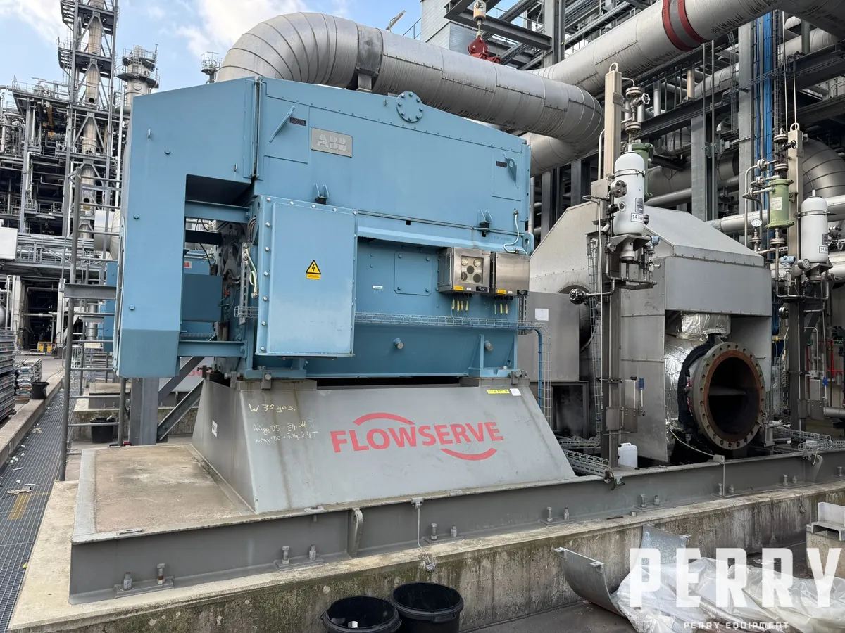 Used Flowserve type 600LNN975 centrifugal pump. Unit is rated 4,250 m3/hr at 33.5m head, 595 rpm. Unit rated 16 bar maximum pressure at -15 to 25 deg.c. temperature. Casing is carbon steel (A216 Gr. WCB), shaft is carbon steel (EN10083-C35E) and impeller is austenitic stainless steel casting alloy(A743 Gr. CF-8M). Unit driven by ABB electric motor rated 1000kW, 593rpm. Unit is mounted on mild steel frame.