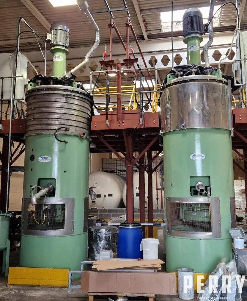 Used Netzsch model PMB VC2500 stainless steel variable capacity pre-mix disperser. Approximately 600-2500 litre working capacity. Unit has welded base and bolted dished top head. Has top entry stainless steel 3-tier 4-blade pitched paddle agitator direct driven by 7.5kW, 415 Volt, 3/50, 1435rpm motor via Renold model PM60 gearbox rated 48.2/1 reduction ratio. Unit has bottom entry stainless steel scraped surface agitator belt driven by 7.5kW, 3/50, 1,440rpm motor via Renold model SMH8 gearbox rated 25/1 reduction ratio. Has external heating/cooling jacket. Unit has bottom discharge.