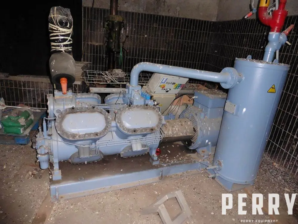 Used Gea Grasso 10 Series reciprocating single stage compressor for industrial refrigeration model Grasso 810. Compressor max. rated 580 m3 per hour of NH3 at 25,5 bar max. pressure. Mounted on frame included control panel and Gea Grasso OS5 pressure vessel. New 2009.