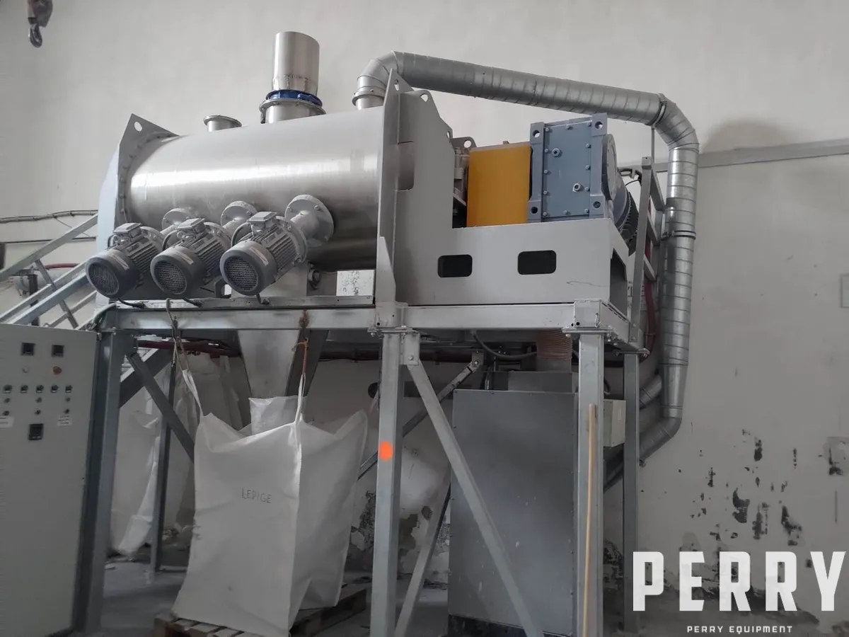 Used Shanghai Shengli Machinery Manufacture model LDH-1,5P, stainless steel ploughshare mixer. Has 1500 litre total capacity and approx. 600-900 litre working capacity. Stainless steel mixing chamber has diameter approximately 980 mm x 1950 mm long, has (2) side feeding/inspection hatches 480 mm x 380 mm, also has (3) top inlet with diameter 2x 200 mm and 1x 300mm. Bolted plougshare mixing blades belt driven by 37 kW, 50 Hz. Standard rope type of sealing on horizontal shaft. Has (3) choppers directly driven by 5,5 kW, 50 Hz, 380 V, 1460 RPMs el. motors. Has rectangular 180 mm x 530 mm central bottom outlet with manually operated clack valve. Includes control panel with frequency converter, and carbon steel base.