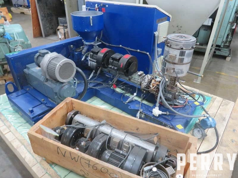 A) Extruder having an electrically heated, air-cooled barrel. A second complete barrel, screw, and heaters are included to convert the machine to a 30:1 L/D ratio. Gearbox is belt driven by a 30 HP Reliance D/C motor with SCR control. Includes hopper, water cooled gearbox, grooved feed throat, and operator control panel with seven (7) zones of temperature control. Instrumentation includes controllers for (4) barrel zones, (3) die zones, blower control, speed control dial, and gauges for extruder Amps, RPM, pressure, and melt temperature. S/N 0205. Manufactured in 1989. Very clean. 460/3/60 input power.