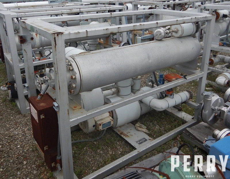 Used 30 kW Industrial Engineering Equipment Syltherm temperature control unit. 5 HP 480 volt, 30 kW, 450°F. Heat exchanger 150 psi at 450°F; 150 psi at -100°F. Catalog no. 359X-0557, identification no. C-91. Herzog hart corp Engineering model# IE 30/30L, S/N 10017, tag #-hr-5102, heat exchanger NB 935.