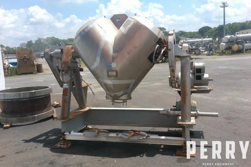 Used Patterson Kelley 20 cubic foot stainless steel twin shell processor. Rated 100# per cubic feet Max material density. Jacket rated 30 psi/full vacuum @ -20°/250° vacuum. Includes liquids/solids bar. Reeves 7.5 HP main drive. Manual gate discharge valve.