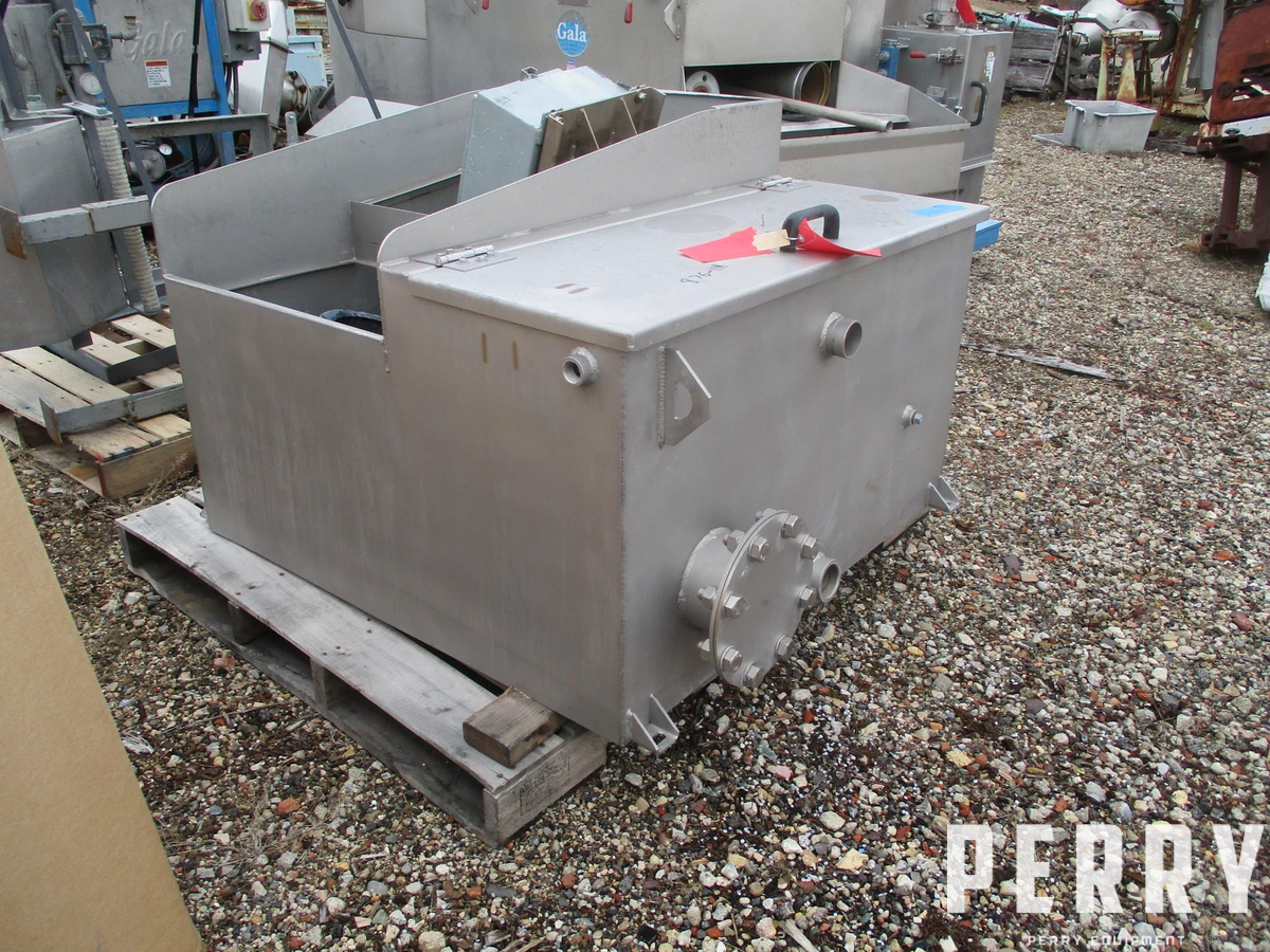 Used Gala SS bin only. Square construction, 38" x 39" with hinged top cover on 1/3 of top of bin, and openings on balance of 2/3. No pumps or filters included.