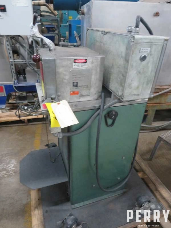 Used Sheer Bay strand pelletizer, Model SGS-50-E. Serial #SES-0707. Nominal 2″ wide entrance. Has 20 knife carbide inlay helical style rotor driven by an A/C motor with Reliance variable speed controller. Mounted on caster base. 460-volts. 4.5 FLA.