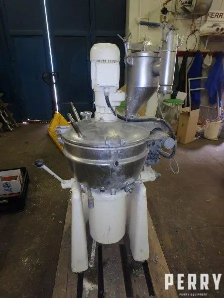 Used high intensity stainless steel jacketed mixer made by Stephan, type UM/HC 40E with working capacity approx. 40 litres. Stainless steel wall scrapper rotates 31 rpm top driven through gear box by el. motor 1370rpm/50HZ/400V. S-blade agitator, bottom driven by 1500/3000 rpm/5,5/7,5kW/50HZ/380V el motor. Tilt type of discharge.