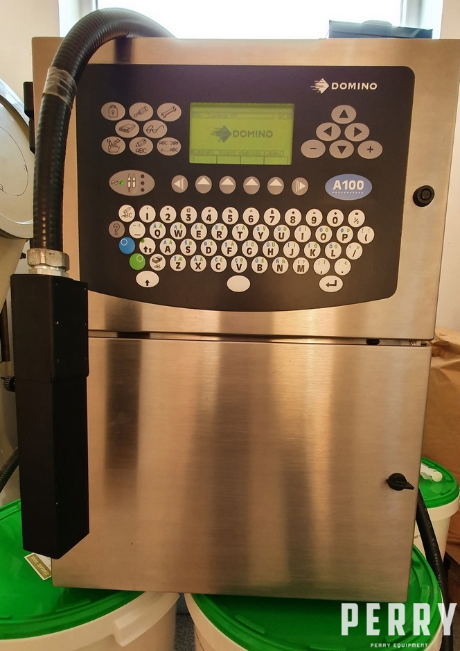 Used Domino A100 stainless steel ink jet coder printer. The A100 can print up to 2 lines with avariety of print formats which include logos, automatic serial numbering/batch coding and real time clocks. Type of keypad: menbrane touch button. Currently installed black atrament color.