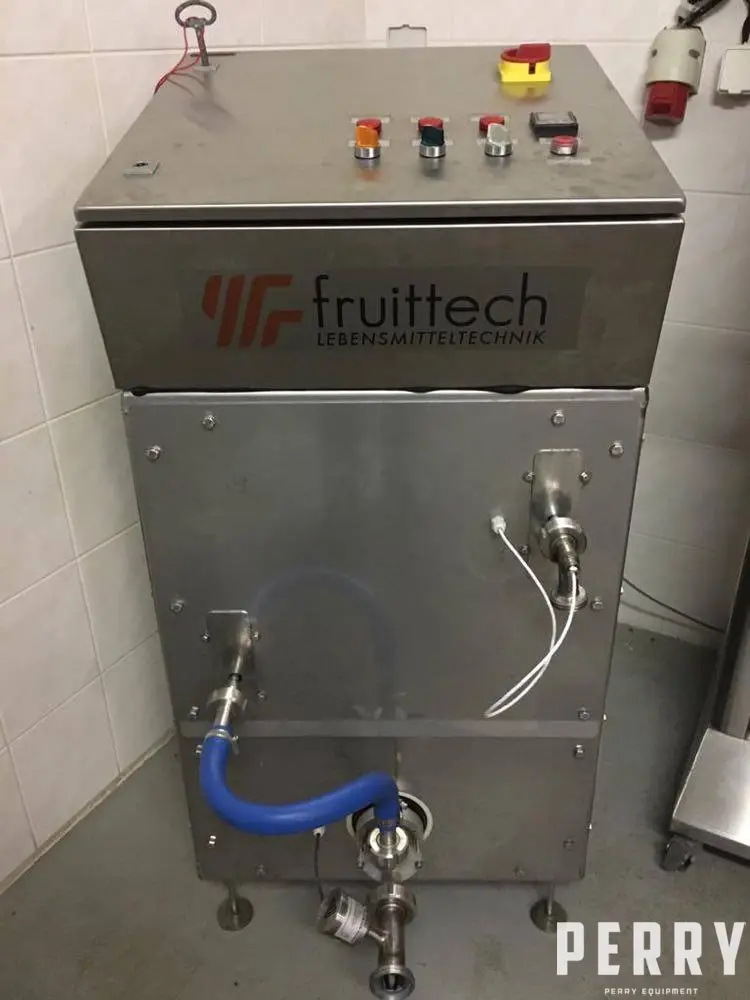 Used Fruittech model ETA PAS 200 E pasteurizer. Approx. capacity 200 litres/hour. Electrically heated, pasteurizing temperature 80-82°C. Suitable for small juice plants. Includes el. switchboard with integrated control panel. Also included (4) head filler. New 2015.