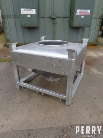 Used approximately 500 litre capacity stainless steel IBC. Approximately 1200mm X 1200mm X 200mm straight side X 420mm conical bottom. Mounted on forkliftable base.