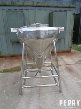 Used approximately 600 litre capacity 316 stainless steel vessel. Unit measures approximately 1100mm diameter X 200mm straight side with a 950mm Cone. Has welded dished top and welded Cone bottom heads. Unit is mounted on (4) legs.