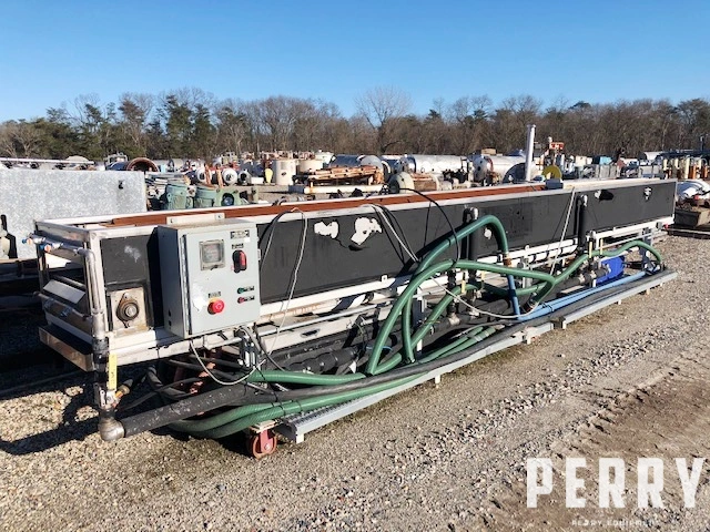 Used 22" wide x 23' long stainless steel cooling tank mounted on rails with powered conveyor rollers, spray bars. No lid included. Mounted on adjustable height stand.