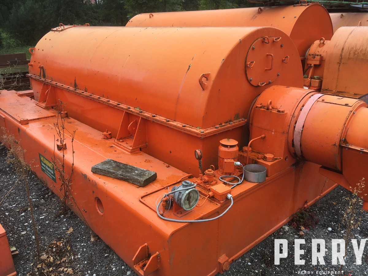 Used KHD type S5-1 decanter centrifuge. Speed output 1130 rpm, Drum diameter 1120 mm, Drum wall thickness 20mm, Drum material ST52-3N, Hydraulic B/C 55-180 KE.