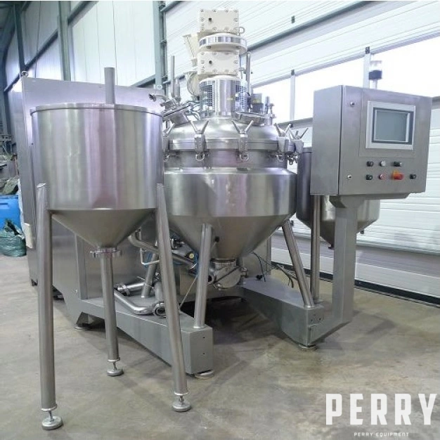 Used stainless steel jacketed vacuum process vessel with a total capacity of 200 litres and a batch capacity of 60-160 litres driven by a 1.5kW motor. Includes homogenizer driven by 30kW variable motor 500-3000 rpm and variable speed 10-40 rpm contra rotating scrapper. Lid lifts hydraulically. CIP nozzles (DN50) on lid. Automatic Dosing nozzle (DN25) for water. Includes (1) receiver vessel for powders and (1) receiver vessel for fluids.