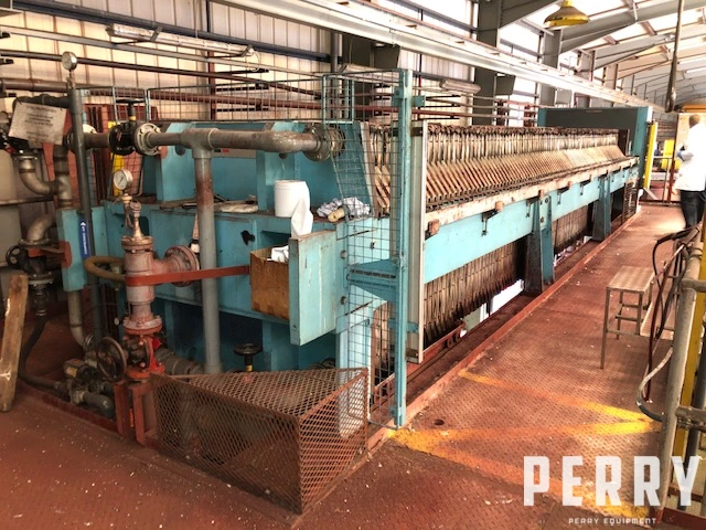 Used Edwards & Jones approximately 445 sqmt polypropylene plate filter press. Unit has (100) 1,500mm x 1,500mm recessed filter plates with approximately 50mm cake thickness. Has centre feed position with 7 bar feed pressure and (4) corner eye drainage. Has electrically operated open / closure driven by 18.5kw motor. Includes plate separation system driven by 2.2kw motor. Unit has mild steel frame.
