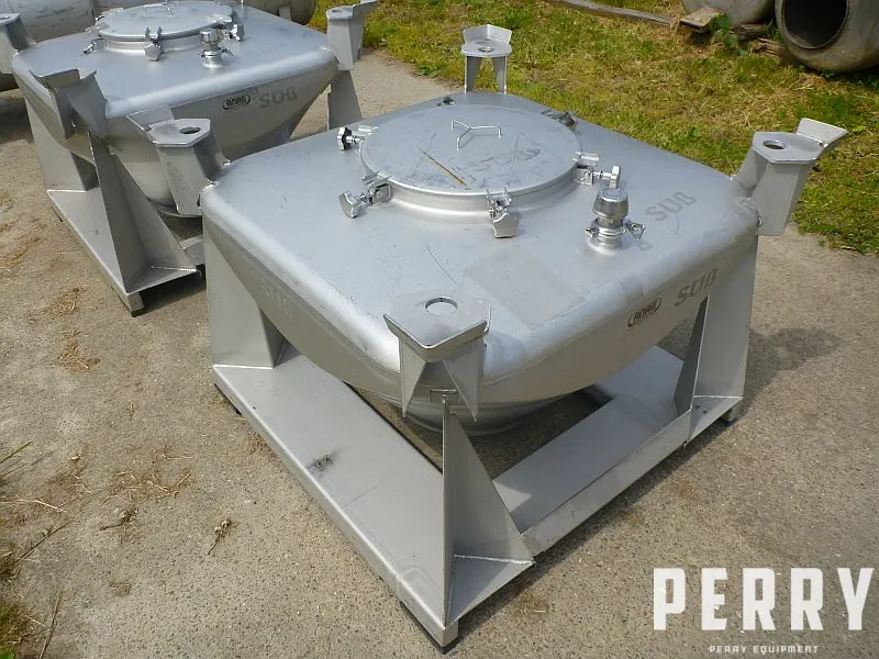 Used stainless steel powder container by Anag (Switzerland) type SUSS with working volume about 300 l. Tank has a dimensions 1100 mm x 1100 mm x height 600 mm. Tank has top inlet with bolted lid, diameter 500 mm, conical bottom and central discharge with diameter 500 mm. No valve included. Tank is mounted on stainless steel frame with supports for forklift. Shipping dimensions 1200 mm x 1200 mm x height 800 mm.