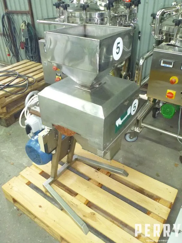Used roll mill for grain with twin rolls. Each roll has width 70 mm. Adjustable gap. Rolls designed in carbon steel. Mill has stainless steel cover with hopper with dimensions 315 mm x 295 mm. Inlet feeding material on rolls has dimensions 100 mm x 55 mm. Bottom outlet has dimensions 200 mm x 150 mm. Rolls are belt driven by el motor 4 kW. Mill is mounted on stainless steel supporting frame and has local start/stop panel.