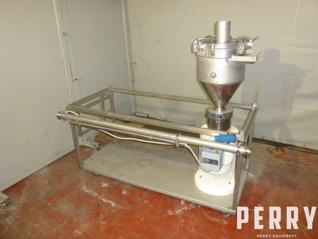 Used Stainless steel BROGLI colloid mill-Type collovelox-Feed hopper-Outlet Ø 45 mm-Drive 5,5 kw - Hp 7,5 - Rpm 3000 - 380/660 volts-On mobile stainless steel frame