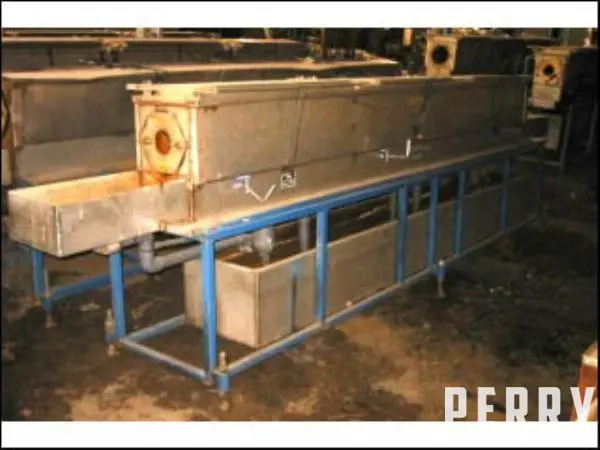 Used 12' long stainless steel cooling tank, spray or flood design, 12" X 12" chamber, 8" diameter maximum opening 3 compartment, adjustable height with covers and 2 HP 208-230/460 volt circulation pump.