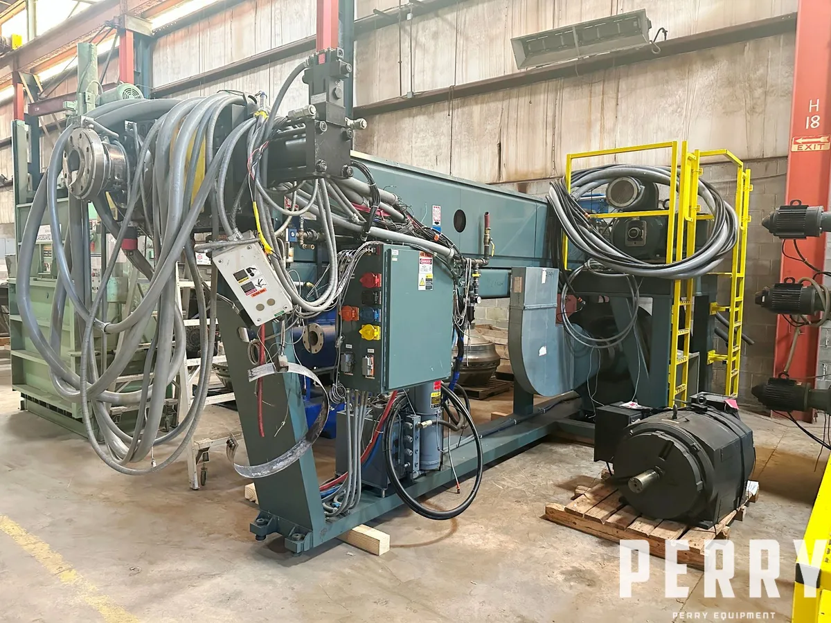 Downstream of the line includes a 56" x 18" x 24" inclined chill roll stack with polished chrome rolls, hydraulically loaded and includes individual roll drives. Includes 4-zone "Green Box" pumping package for primary roll cooling and secondary roll cooling. New 2016. Has a spare 24" OD matte finish roll for center position on stack.
