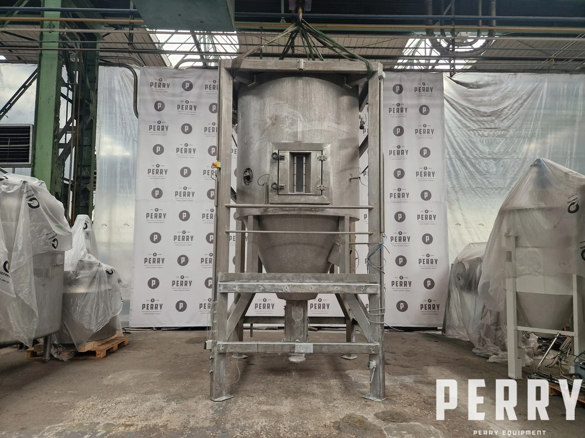 Used APV Anhydro model PSBD 58 stainless steel spray dryer. Unit rated approximately 50 kg/hour water evaporation rate (depending on product) at inlet/outlet temperatures of 600/140°C. Drying chamber approximately 1600 mm inside diameter x 1800 mm cylindrical height x 1500 mm conical height. Chamber has a safety rupture plate buti is not connected. Outside is insulated and claded by stainless steel plate. Inspection doors 450 x 550 mm. Unit includes (1) top mounted Anhydro nozzle co-current atomiser (could be used rotary atomiser but is not included). Unit includes 2 zones electrical air heater, Herding carbon steel filter, cyclone and ventilator. Electrical switchboard with integrated control panel is included. Has a ....PLC control system.