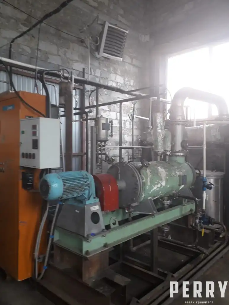 Used stainless steel horizontal wiped film evaporator by Luwa type Saco KH100. Evaporator has heat exchange surface 1 m2. Contact parts designed in stainless steel 316 Ti, jackets designed in stainless steel 321. Internal tank has volume 170 l and is rated for work on pressure -1 bar and temperature up to 250C. Jacket has two sections - one with volume 15 l ,second with volume 6 l. Both are designed for work on pressure up to 10 bar and temperature up to 250C. Evaporator has a rotor driven by el. motor 7.5 kW. Machine is equipped with two screw pumps - feeding product and receiving product, two vacuum pumps, one centrifugal pump, vacuum bufer tank, condenser and control panel. Includes technical documentation.