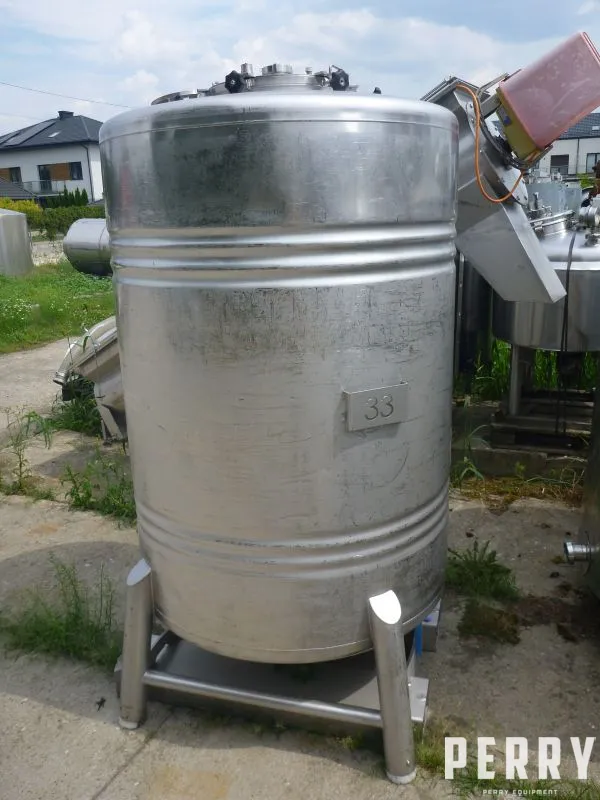 Used vertical stainless steel storage tank. Working volume about 1400 l. Internal diameter 1080 mm x length of straight side of the wall 1480 mm. Top inspection manway with bolted lid - diameter 410 mm. Connection for mounting agitator: diameter 110 mm. Bottom conical with discharge outlet and manually operated valve. Mounted on 4 legs and supports for work with forklift.
