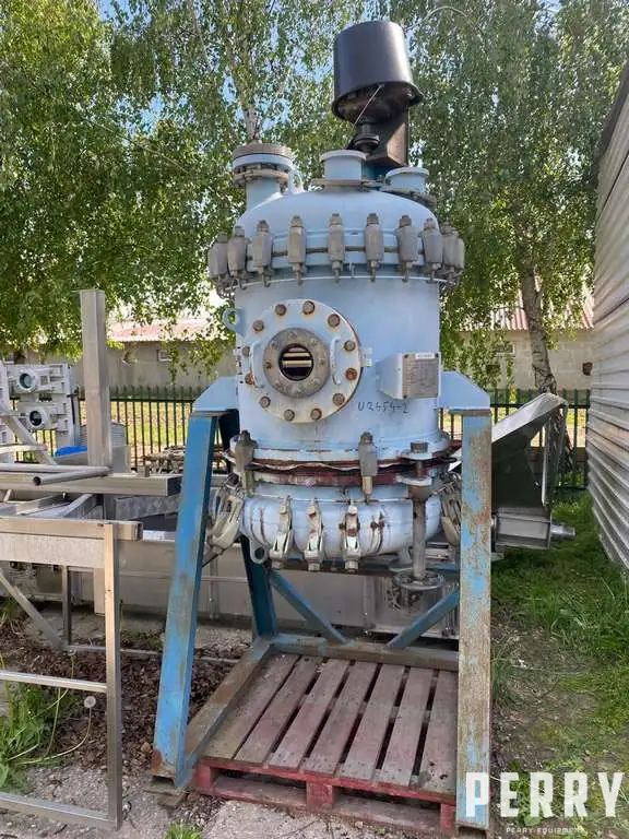 Used, vertical, glass lined pressure filter by Lampart (Hungary) type SDK-M300L with total volume 565 litres and working volume 300 litres. Filter has filtration surface of 0.48 m2 and an internal diameter of 780 mm. Internal working pressure range from -1 to 3 bar in a working temperature range from -25 to 200 degrees Celsius. Top feeding and central bottom discharge outlet, including glass lined valve. Filter has inspection manway with diameter 250 mm on the side wall equipped with lid. Bottom head has a welded carbon steel cooling/heating jacket with a capacity of 35 litres and can operate at pressure range from -1 to 3 bar in a working temperature range from -25 to 200 degrees Celsius. Machine is equipped with a top mounted stainless steel propeller agitator which is directly driven by an electric motor. Filter is mounted on a carbon steel frame.
