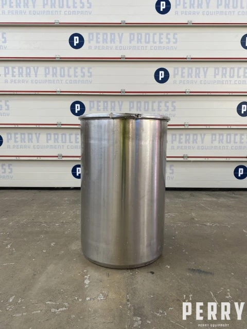 Used Pharmatech stainless steel tank with an approximate capacity of 200 liters. The tank has a diameter of approximately 500mm and a straight side height of 900mm. The unit features a ring-clamped lid and a welded flat bottom.