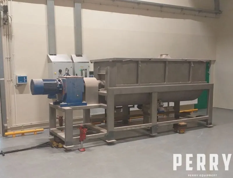 Used stainless steel ribbon mixer by Młynpol (PL) model MP-3000. Mixer has volume 3000 l. Mixing shaft has welded double ribbon, and is driven via gearbox and el motor 22 kW. Central discharge outlet with pneumatically operated slide valve. Mixer is equipped with two hi-intensity agitators/choppers, each working with rotation 920 rpm. Top open, with hinged lid. Mixer mounted on stainless steel supporting frame. Shipping dimensions: L 510 cm x W 134 cm x H 195 cm x weight approx 2700 kg. Last time machine had been working in food industry.
