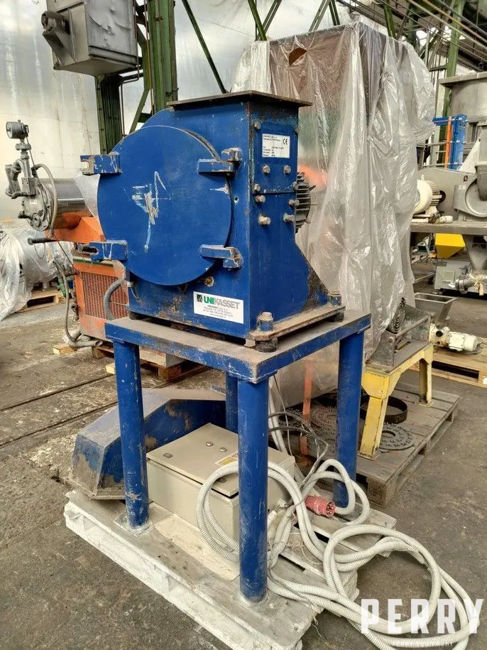 Used carbon steel grinding mill made Unikasset, model VMD - N. Rotor is driven by el. motor 5,5 kW. With control panel and hopper.