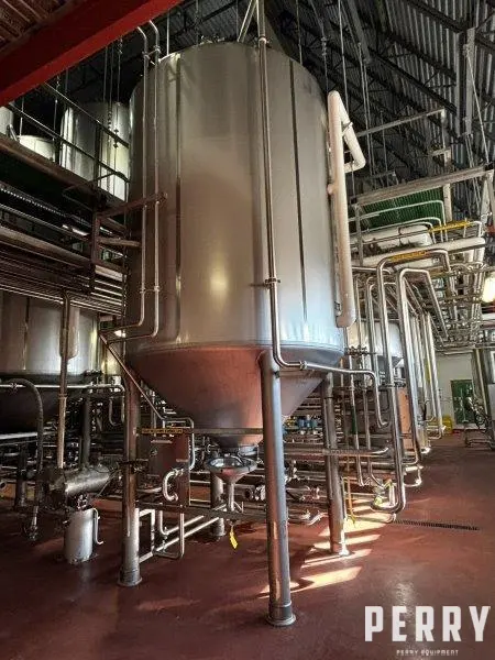 Used 4,150 gallon 304 stainless steel, jacketed, cone bottom vessel. Manufactured by Mueller. Internal 15 PSI @ 100°F. Dome top. 97 7/16" OD x 219" (4) leg mounted. Serial #164585-2. Previous use: 150 BBL Brewery Fermentation Vessel.