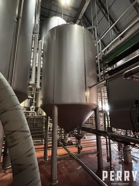 Used 4,150 gallon 304 stainless steel, jacketed, cone bottom vessel. Manufactured by Mueller. Internal 15 PSI @ 100°F. Dome top. 97 7/16" OD x 219" (4) leg mounted. Serial #164585-3. Previous use: 150 BBL Brewery Fermentation Vessel.