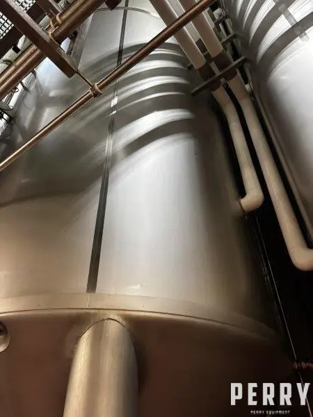 Used 16,600 gallon 304 stainless steel tank, jacketed, cone bottom. Manufactured by Mueller. Dished head. 10' 1 7/8" OD x 36' 11 3/8" tall. Shell rated 15 psi @ 100°F. Jacket rated 100 psi @ 100°F. Weight: 13200 lbs. Built 1995. Serial #164563-5. Previous use: 400 BBL brewery fermentation vessel.