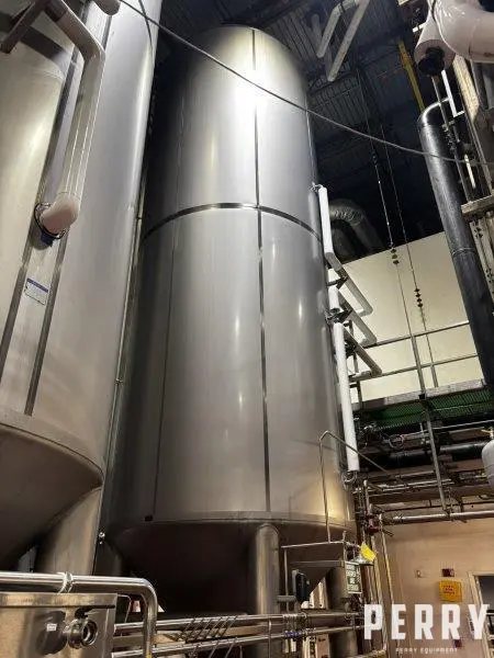 Used 16,600 gallon 304 stainless steel tank, jacketed, cone bottom. Manufactured by Mueller. Dished head. 10' 1 7/8" OD x 36' 11 3/8" tall. Shell rated 15 psi @ 100°F. Jacket rated 100 psi @ 100°F. Weight: 13200 lbs. Built 1995. Serial #164563-8. Previous use: 400 BBL brewery fermentation vessel.