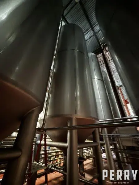 Used 16,600 gallon 304 stainless steel tank, jacketed, cone bottom. Manufactured by Mueller. Dished head. 10' 1 7/8" OD x 36' 11 3/8" tall. Shell rated 15 psi @ 100°F. Jacket rated 100 psi @100°F. Weight :13200 lbs. Built 1995. Serial #164563-12. Previous use: 400 BBL brewery fermentation vessel.