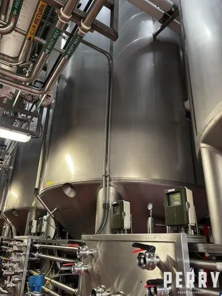 Used 16,600 gallon 304 stainless steel tank, jacketed, cone bottom. Manufactured by Mueller. Dished head. 10' 1 7/8" OD x 36' 11 3/8" tall. Shell rated 15 psi @ 100°F. Jacket rated 100 psi @ 100°F. Weight: 13,200 lbs. Built in 2008. Serial #294433-4. Previous use: 400 BBL brewery fermentation vessel.