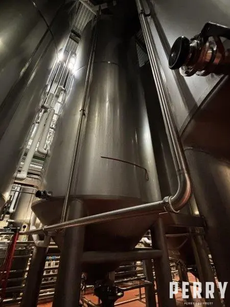 Used 16,600 gallon 304 stainless steel tank, jacketed, cone bottom. Manufactured by Mueller. Dished head. 10' 1 7/8" OD x 36' 11 3/8" tall. Shell rated 15 psi @ 100°F. Jacket rated 100 psi @ 100°F. Weight: 13,200 lbs. Built in 2008. Serial #382414-2. Previous use: 400 BBL brewery fermentation vessel.