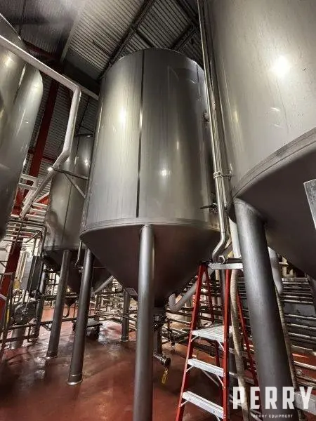 Used 8,300 gallon 304 stainless steel tank, jacketed, cone bottom. Manufactured by Mueller. Model F. Internal 14.9 PSI @ 100°F. Cooling Jacket 100 PSI @ 100°F. 143"T/T x 117"ID. 267" OAH. Dome top. 16" bottom cone manway with 3" CBO. (4) leg mounted. Serial #18101280301-02. Built 2010. 200 BBL brewery fermentation vessel.