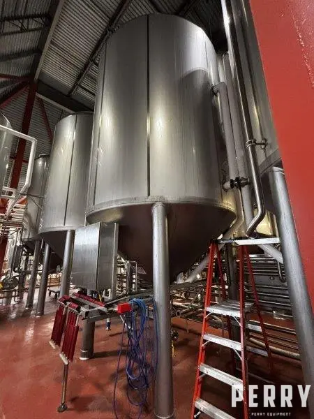 Used 8,300 gallon 304 stainless steel tank, jacketed, cone bottom. Manufactured by Mueller. Model F. Internal 14.9 PSI @ 100°F. Cooling Jacket 100 PSI @ 100°F. 143" T/T x 117" ID. 267" OAH. Dome top. 16" bottom cone manway with 3" CBO. (4) leg mounted. Serial #18101280301-04. Built 2010. 200 BBL brewery fermentation vessel.
