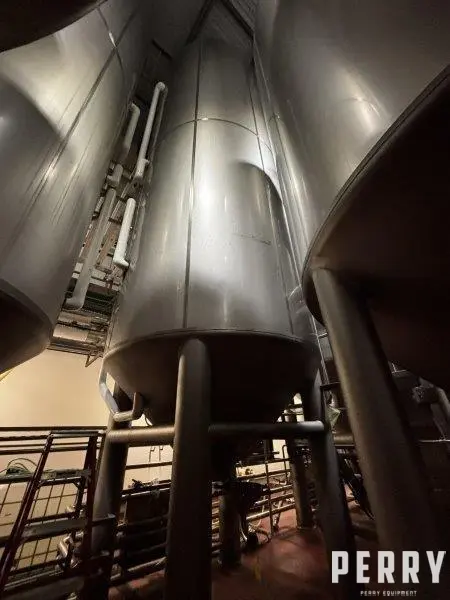 Used 16,600 gallon 304 stainless steel tank, jacketed, cone bottom. Manufactured by Mueller. Dished head. 10' 1 7/8" OD x 36' 11 3/8" tall. Shell rated 15 psi @ 100°F. Jacket rated 100 psi @ 100°F. Weight: 13200 lbs. Previous use: 400 BBL Brewery Brite Tank.